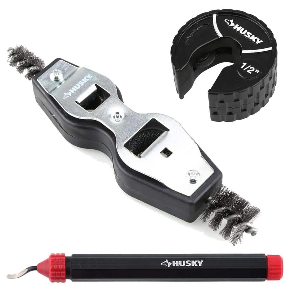 Husky’s 1/2 in. Automatic Tube Cutter makes cutting copper tubes easy and intuitive. The spring-loaded cutter wheel tightens while turning to maintain constant pressure, resulting in cleaner cuts. The hardened steel wheel and lightweight plastic body makes cutting smoother. The Automatic Tube Cutter has 1/2 in. maximum nominal pipe capacity (5/8 in. outer diameter). Husky’s Deburring Tool removes burrs from metal or plastic pipe edges resulting from cutting, drilling, grinding or milling tasks. The blades are easy to replace using the push button blade release. Includes two types of blades: the black deburrs aluminum, copper and PVC pipes while the silver deburrs brass and cast-iron pipes. Husky’s 6-in-1 Fitting Brush features high-carbon, hard-tempered steel bristles for professional applications. The perfect addition to any plumber’s tool box, use this brush to clean the inside and outside of copper and plastic pipes; can also be use as a b-tank gas key and a bottle opener. All tools are covered by the Husky lifetime warranty for guaranteed long-lasting use.