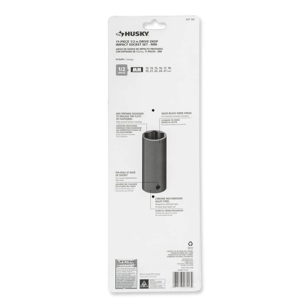 The 1/2 in. Drive Deep Metric Impact Socket Set includes 11 deep 6-point impact grade sockets with a socket rail for easy storage. Husky 1/2 in. drive deep impact sockets are forged from chrome molybdenum alloy steel (Cr-Mo) and designed to withstand rigors of heavy duty auto and industrial use. Size markings have been hard stamped into the sockets for quick and easy identification that will never wear away. These impact sockets also feature off-corner loading which helps prevent fastener rounding, plus a pin hole at the base of each socket for use with pin and O-ring for a secure attachment to drive tools. An oiled, black oxide finish gives you maximum corrosion resistance. This 11-piece Husky impact socket set is perfect for both the professional mechanic’s or the DIYer’s garage.