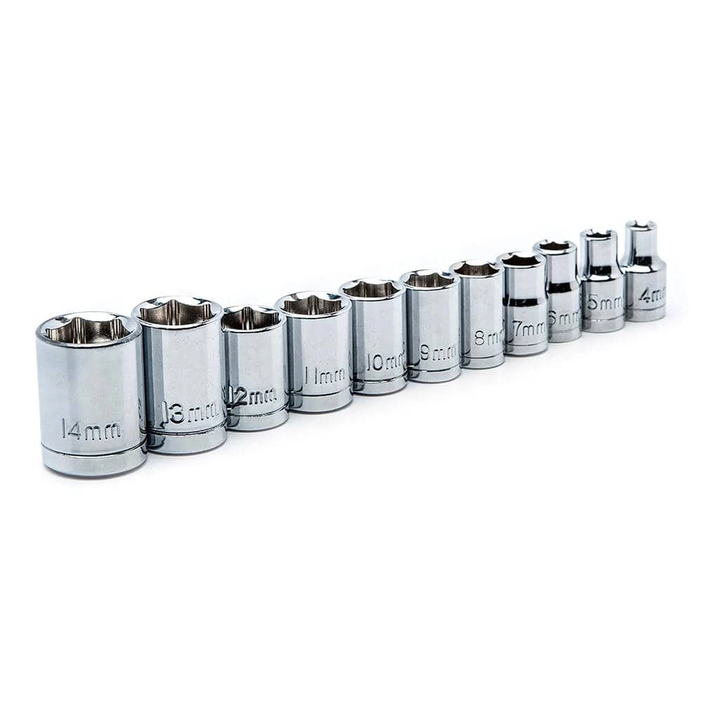The Husky 46-Piece Stubby Ratchet Set includes 22 sockets and 20 screwdriver bits to hand various jobs around the house. The Stubby Ratchet features a 1/4 in. drive tang on 1 side and a 3/8 in. drive tang on the opposite side giving you the versatility to use both drive sizes on 1 ratchet. The co-molded grips on the ratchet, ratcheting bit driver and the adjustable wrench provide a strong and comfortable grip to get the job done. 72-tooth stubby ratchet needs only a 5 degree swing arc to turn a fastener, allowing you to work in tight places. The Husky magnetic bit driver included works with all standard 1/4 in. drive bits. Set is kept organized and travel-ready in the plastic storage case that is marked with each size.