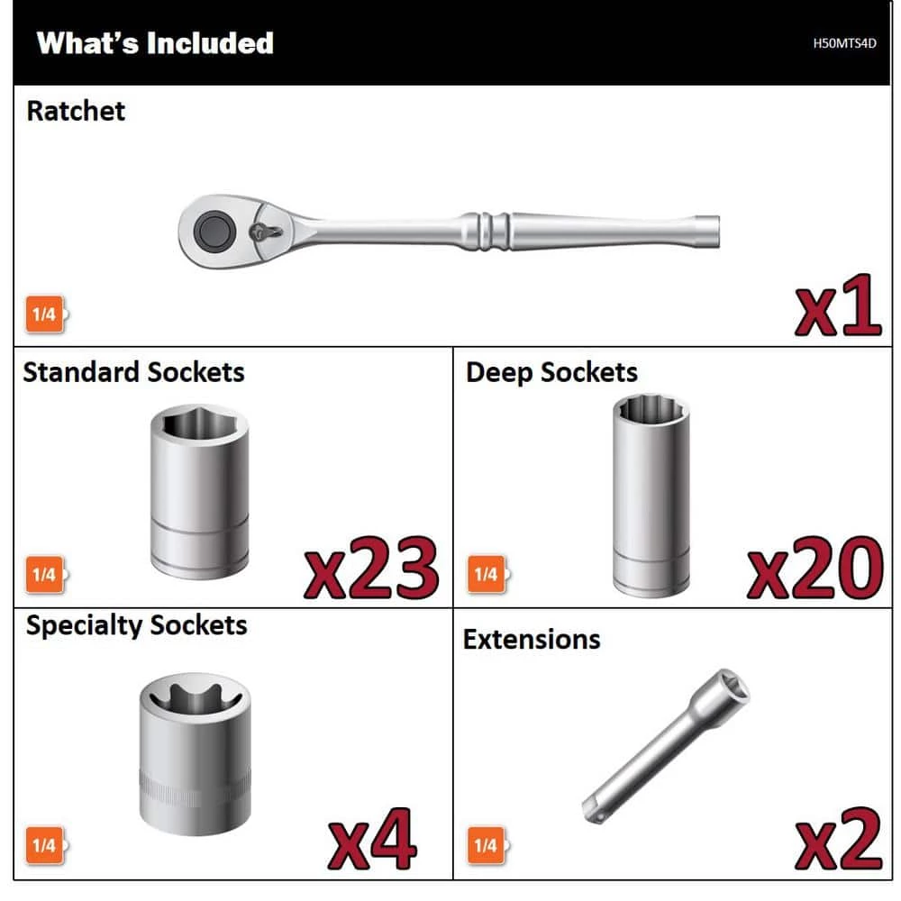Includes 1 ratchet, 43 sockets, 4 bit sockets & 2 extension bars