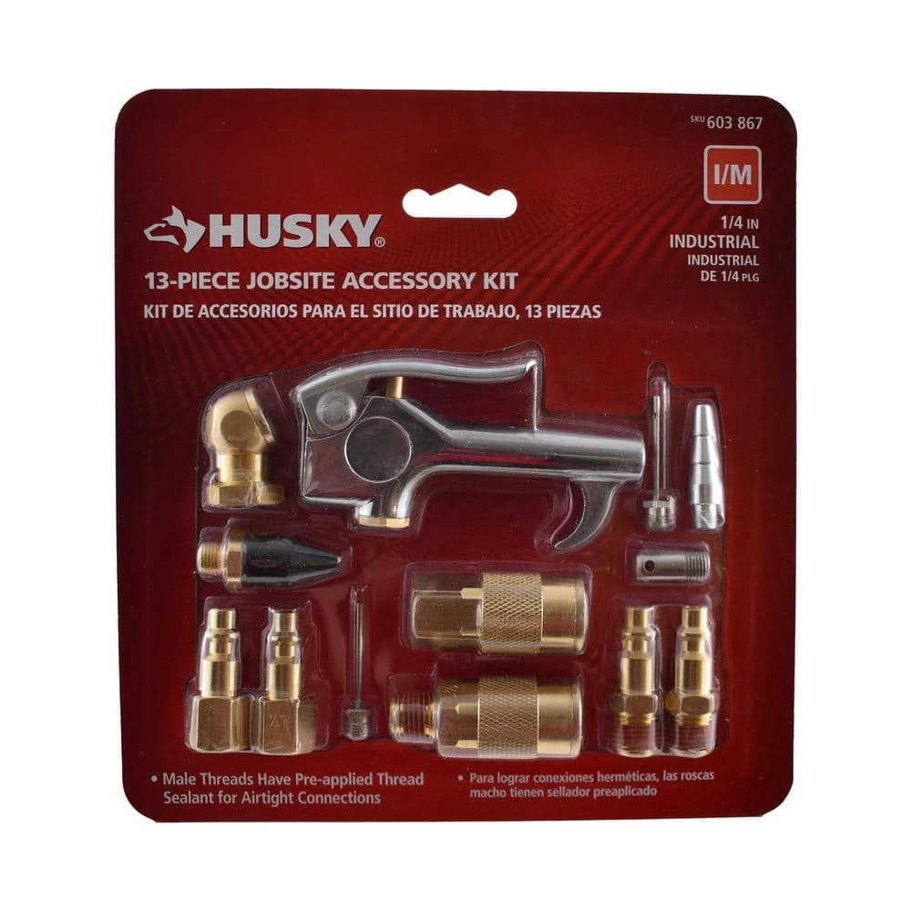 The Husky 13-piece Brass Air-Compressor Accessory Kit includes a blow gun, air chuck, inflation needles, plugs and couplers. It is made for long service life and hassle-free connections without confusion about coupler sizes. The fittings have an easy-connect design with solid brass construction that resists corrosion and wear.