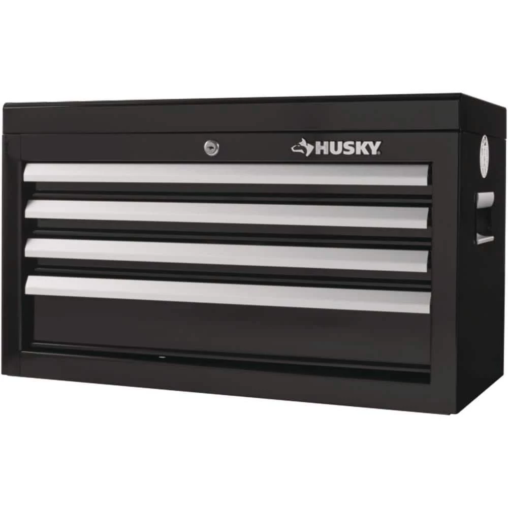 This Husky 26 in. W 4-Drawer Tool Chest is perfect for all of your storage needs. Durable 50 lbs. ball-bearing drawers with smooth detent retention, full width drawer trim and included drawer liners provide easy access and organization when you need it, while the internal locking system provides security when you are away. Gas struts keep the lid open during use and a custom Husky embossed stiffener provides extra stability to the lid.