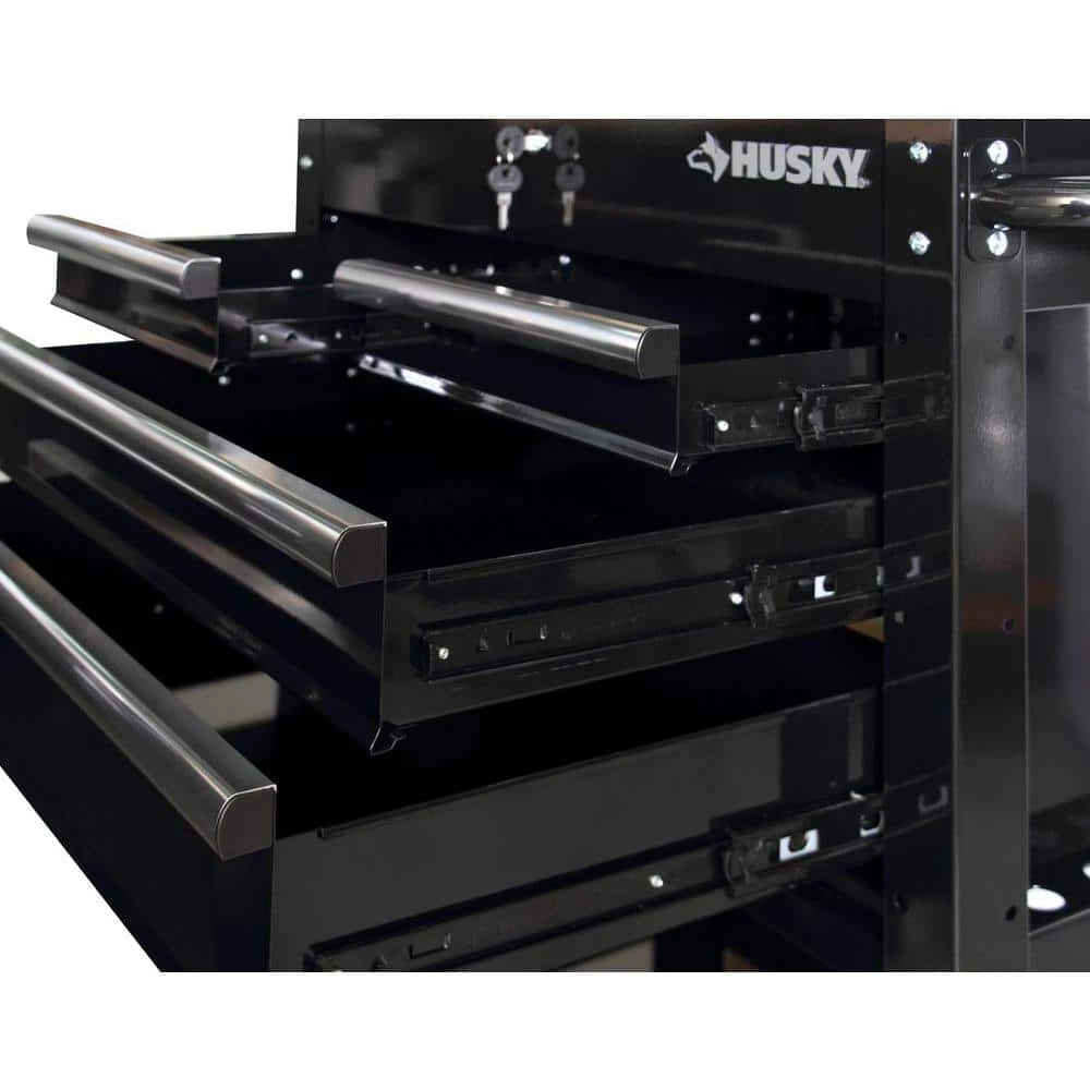 The Husky 33 in. 4-Drawer Mechanics Tool Cart is a heavy-duty utility cart that is essential in the shop, garage or even the office. The multi-sized drawers are equipped with 75 lbs. rated ball bearing slides to hold a variety of tools. The bottom storage tray is reinforced steel for your larger, heavier items and has approximately 14.5 in. of storage space height. The top storage area is a perfect place to keep your commonly used items easily within reach. In addition, the top storage area of the tool cart includes a locking lever to secure the 4-drawers and a keyed lock to secure the lid. The larger, push-bar handle and heavy-duty, 5 in. x 2 in. casters allow this cart to be easily moved around your work area. With no clumsy washers and nuts to deal with, this tool cart can be assembled in minutes with the included bolts and pre-mounted threads.