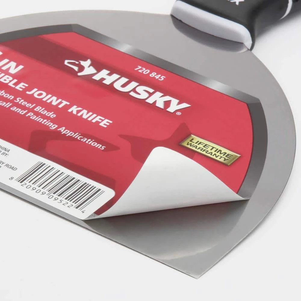The Husky 6 in. Flexible Joint Knife features a hollow-ground carbon steel blade that offers the highest durability and quality finish. The flexible blade bends for easy application of drywall compound and spackle and is both rust resistant and solvent resistant. The soft-grip handle is ergonomically designed to provide comfort and a sturdy grip and includes a finishing hammer end to set drywall nails. Lastly, the easy peel label can be removed from the blade without leaving behind residue.