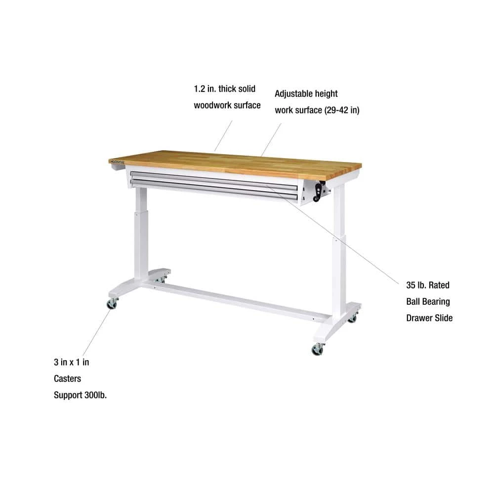 Elevate your work experience with the Husky 62 in. Adjustable-Height Work Table with 2-Drawers. This multi-functional work station features a manual crank that can raise and lower the work surface. The 1.2 in. T, solid wood top is rugged and beautiful and there is plenty of space on the 62 in. W x 24 in. D work surface. The workbench can be assembled with either the four 3 in. x 2 in. polypropylene casters for mobility or attach the 4 leveling feet for use as a stationary table or desk. This work table has plenty of uses around the home, office, hobby room or garage. It is designed with a 300 lbs. weight capacity and an overhang so that you can easily attach your vise grips or cl-Amps while working on a project. This 62 in. Husky Work Table’s contemporary, adjustable-height feature allows you to have the flexibility to sit or stand while working. Research suggests that there are health benefits to alternating between standing and sitting throughout the day because it both decreases body discomfort and increases blood flow. The ergonomic design could also reduce eye and back strain and boost your productivity. The crossbar support can be installed in 2 different locations, depending on your preference. Install the support at the center of the table for an open, 2-sided work area. Or install it along the back of the legs to allow you the versatility of stowing your tool storage and rolling cabinets underneath to further organize your work space.