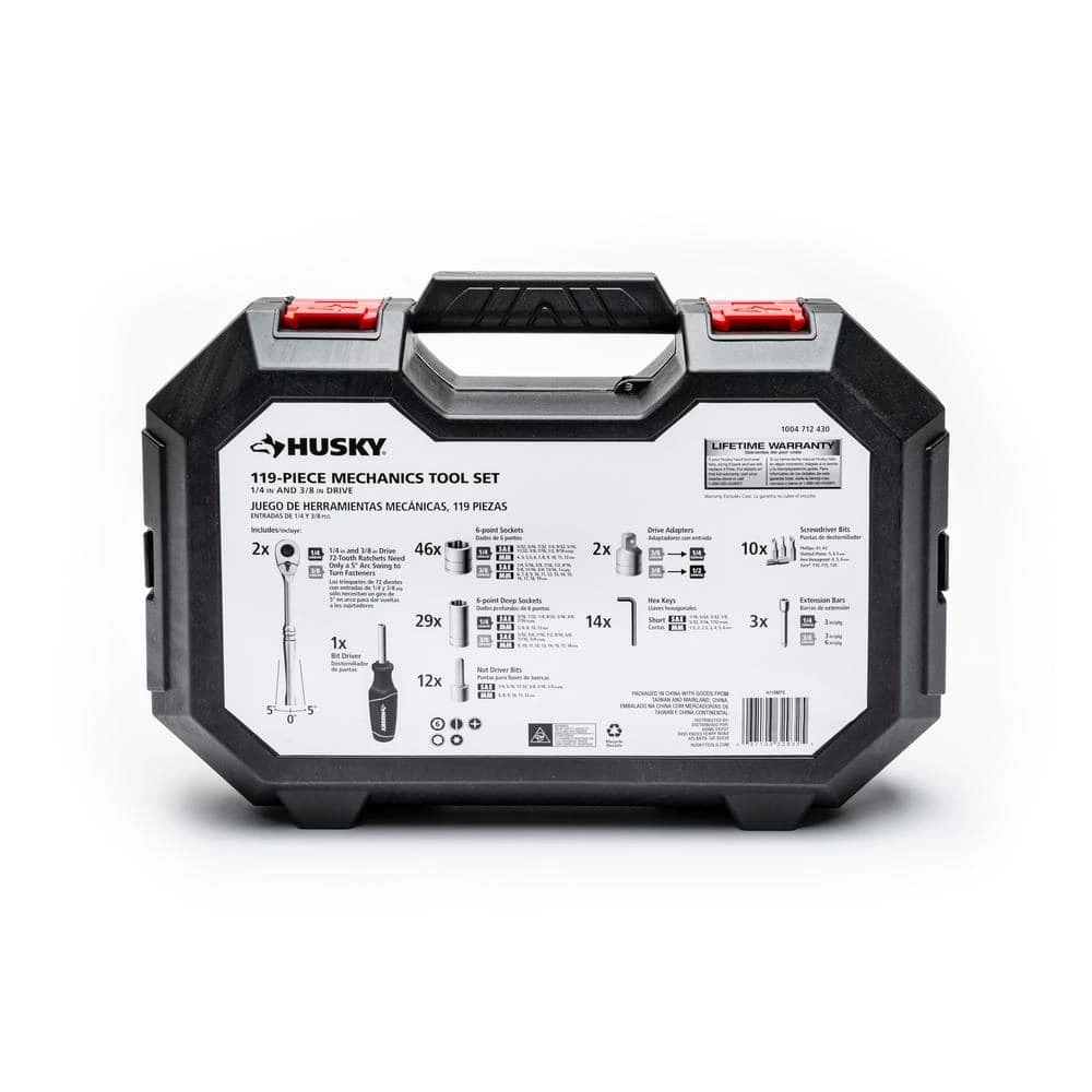 The Husky 119-piece 1/4 in. and 3/8 in. drive mechanics tool set a has an extensive assortment of tools and is an ideal investment for your workshop or garage. The 75 different standard and deep sockets allow you to tackle a wide range of most fastening or repair projects. This Husky 119-piece set is 1 of the most versatile sets available in the Husky line up and is comes in an easy to transport and store case.