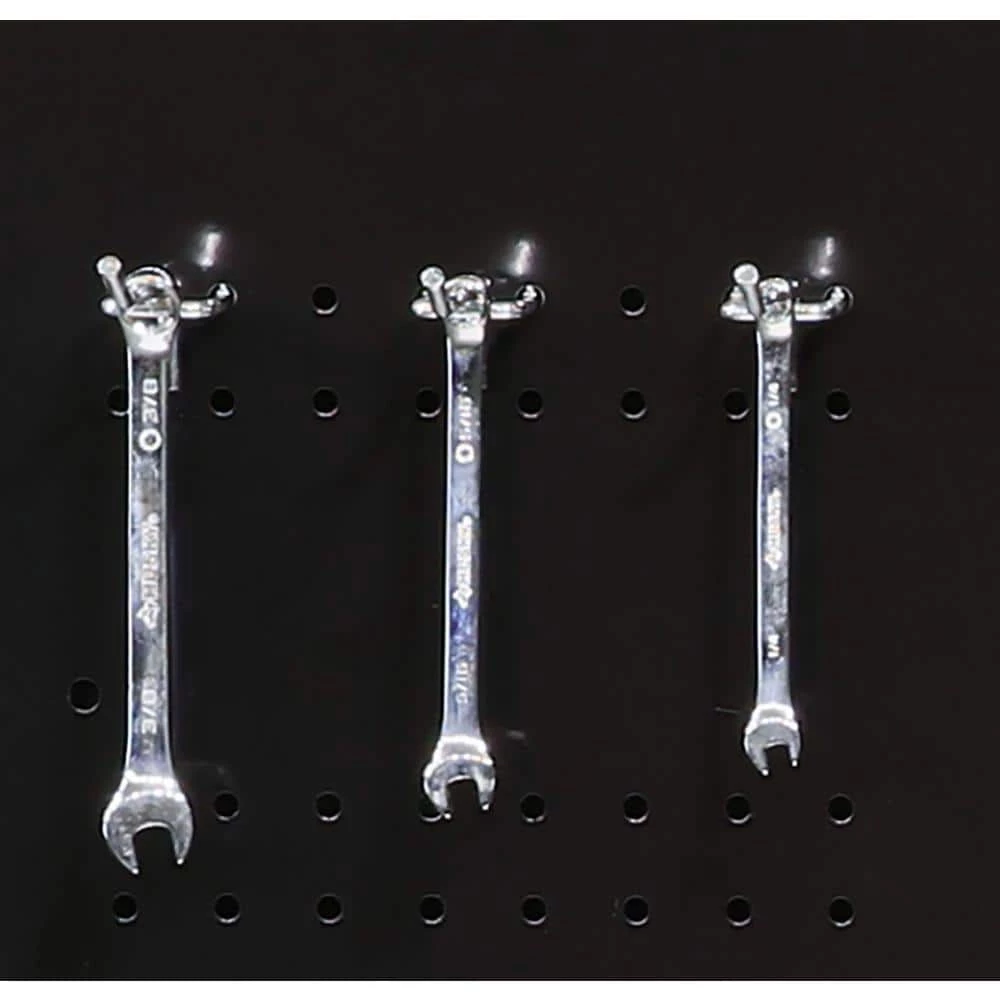 - Sturdy double-wall doors include interior pegboard panels for additional storage (peg hooks sold separately)