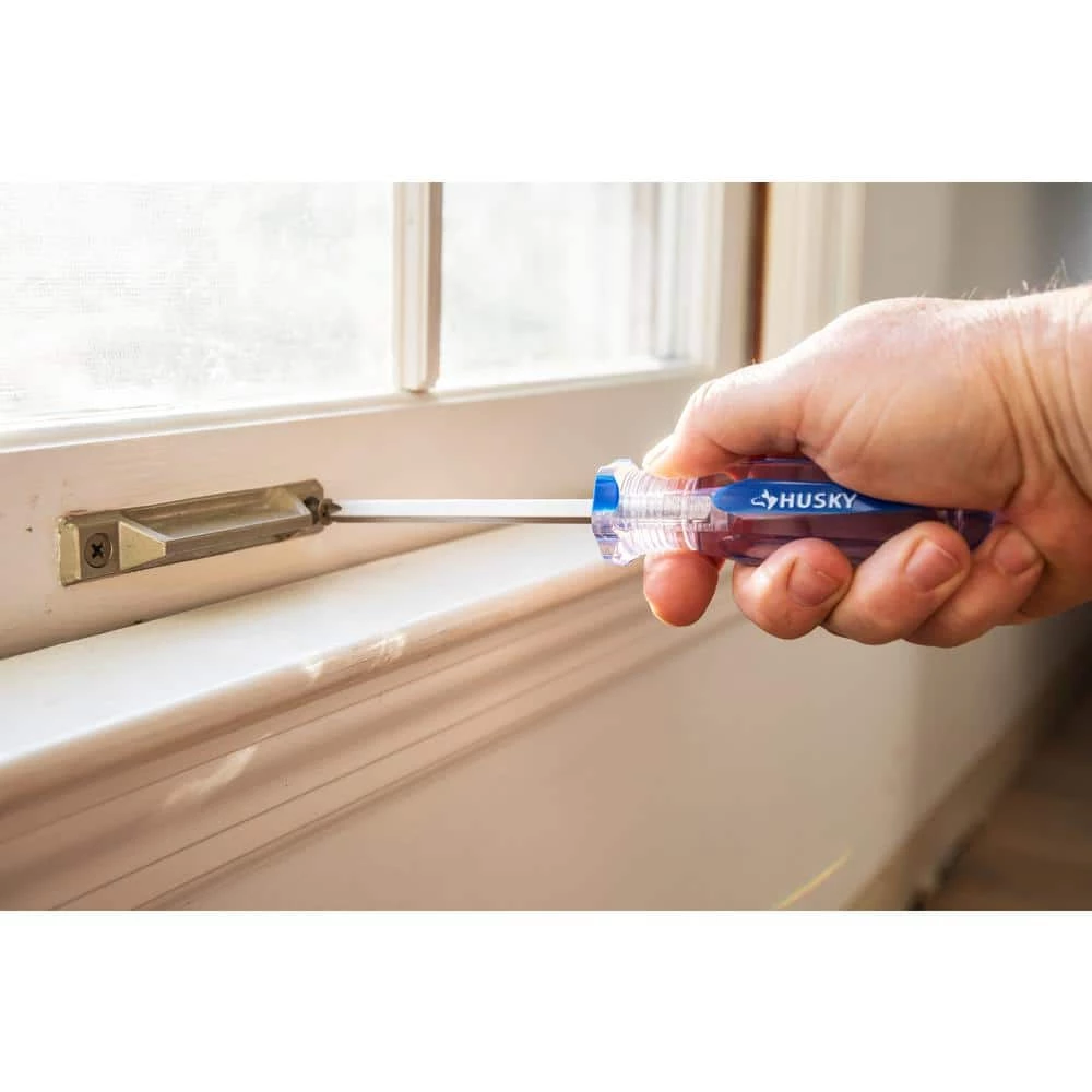 This Variety Screwdriver Set from Husky includes 3 slotted head and 3 Phillips head screwdrivers. Each blade is forged from high strength alloy steel for added strength. The non-slip ergonomic handles are resistant to impact and chemicals.